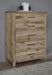 Vaughan Bassett Dovetail 5-Drawer Chest in Sun Bleached White 754-115. Vaughan Bassett has developed a patent-pending process that allows them to accelerate how wood ages. We have kept the splits; knots; cracks; and the bold grain pattern found in Oak lumber to create this reclaimed look in this beautiful and unique bedroom.